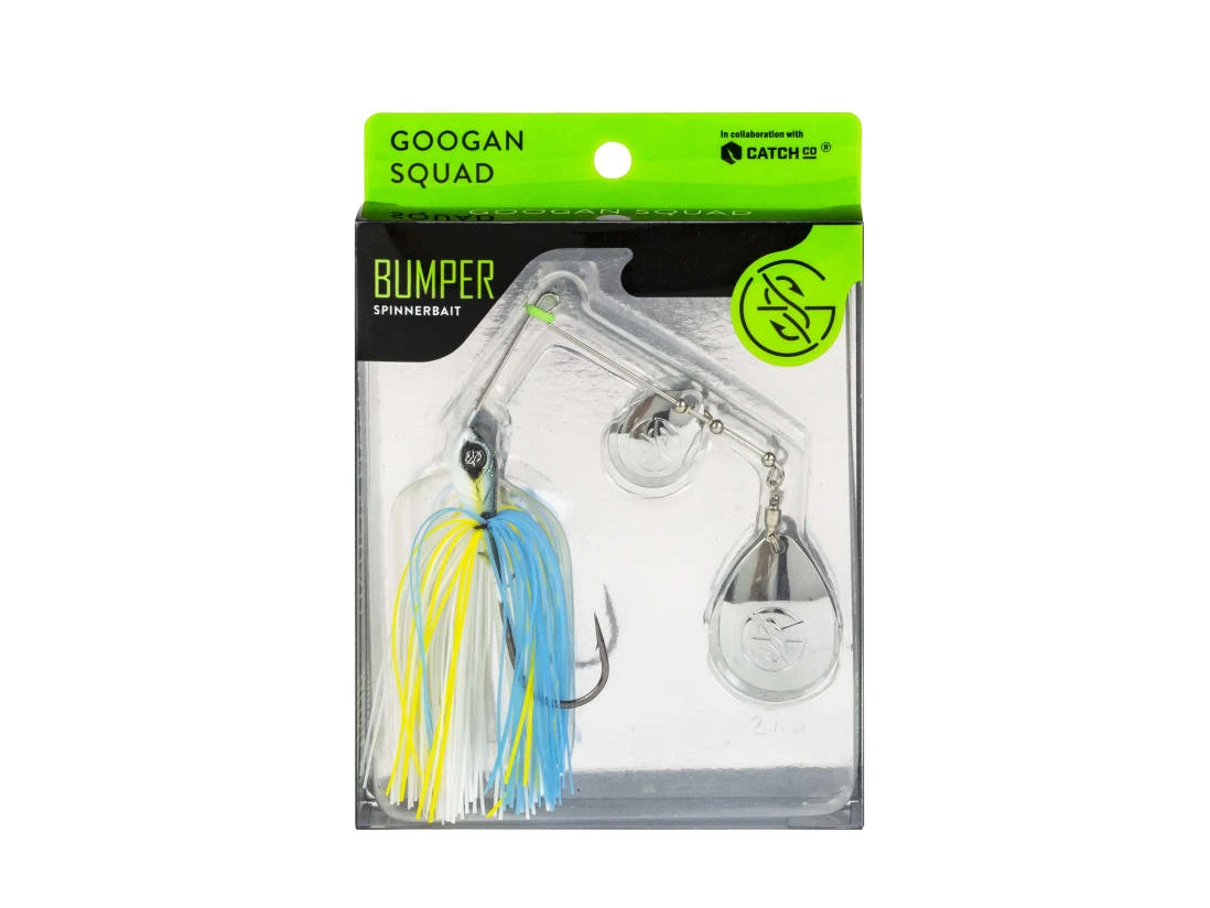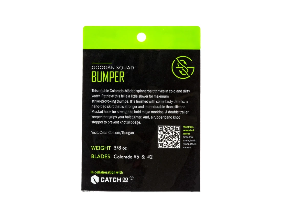 The Googan Squad Bumper is a double Colorado bladed spinnerbait designed to thrive in cold and dirty water. When the waters cold, bass generally don’t want to chase food very far. This bait can be reeled at slower speeds than a willow bladed spinnerbait to provide bass with the right presentation. Similar scenario for dirty water: When bass can’t see far in the water, they use their lateral line to sense whats around them. This heavy thumping spinnerbait sends vibration through the water that allow bass to key in and strike.