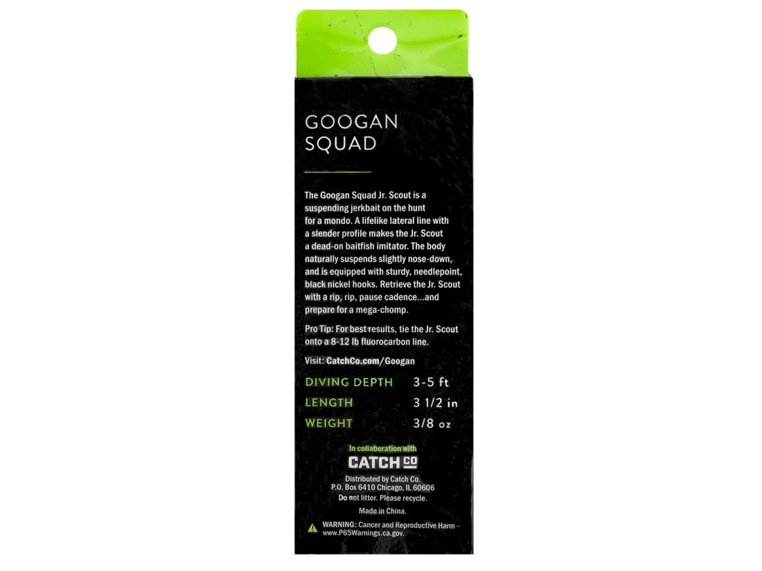 The Googan Squad Jr. Scout is a 3.5-inch hard-bodied jerkbait that looks and swims like a small baitfish — the Googan Jr. Scout operates best on spinning rods with light line. Tie this bad dude on whenever bass are feeding on smaller minnows or shad. The small profile and tasty colorways help this little ripper get bites — each Googan Squad Jr. Scout has a lifelike integrated lateral line that adds realism.