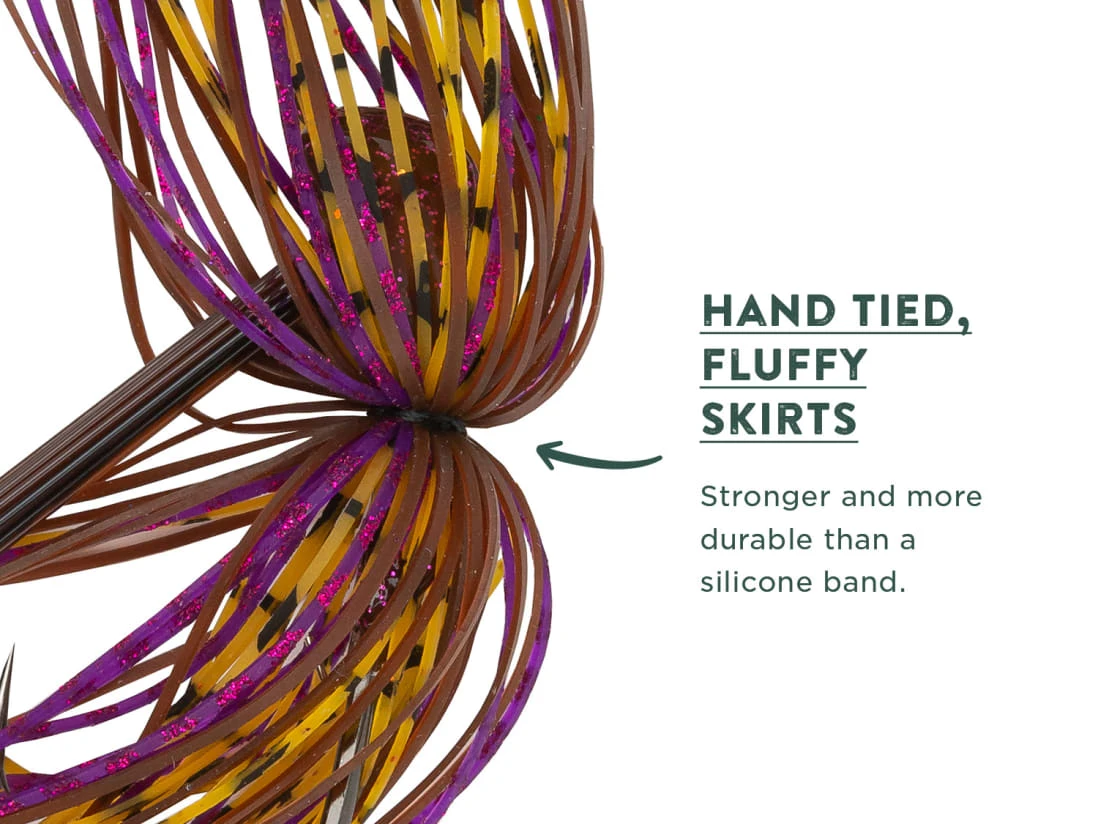 Each Juicee Jig comes with the weight size painted on its head for easy identification. The Juicee Jig also features a U-shaped weedguard that helps prevent snags while increasing your chances of hook up. Built around a Mustad Hook, the Juicee jig features a hand-tied skirt and a double-pronged trailer keeper.